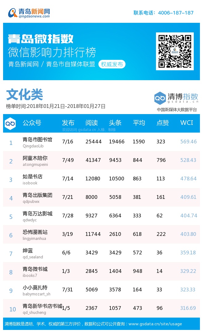 1、“青島微指數(shù)微信影響力排行榜”由青島新聞網(wǎng)聯(lián)合清博指數(shù)平臺(tái)聯(lián)手打造的“青島微指數(shù)微信影響力排行榜”,通過(guò)對(duì)各行業(yè)微信公眾號(hào)的日常監(jiān)測(cè),對(duì)所有賬號(hào)在統(tǒng)計(jì)周期內(nèi)所發(fā)布內(nèi)容的發(fā)文總數(shù)、總閱讀數(shù)、頭條閱讀數(shù)、平均閱讀數(shù)及總點(diǎn)贊數(shù)等海量數(shù)據(jù)進(jìn)行分析,幫助各行業(yè)新媒體小編更好地運(yùn)營(yíng)微信。