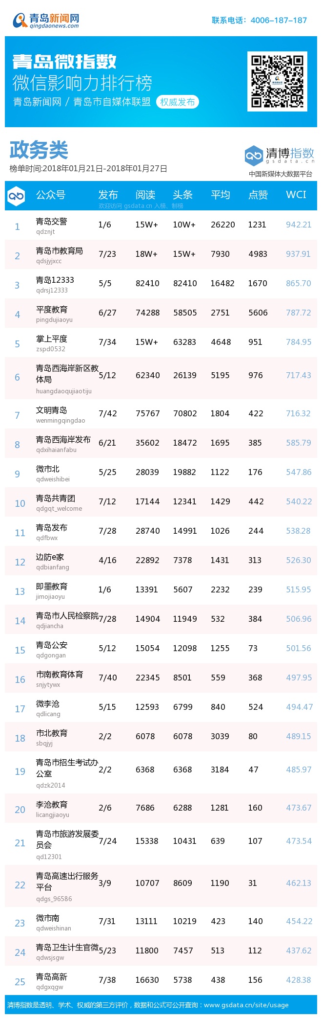 青島新聞網(wǎng)1月29日訊 (記者 邢書玲)由青島新聞網(wǎng)聯(lián)合清博指數(shù)平臺(tái)聯(lián)手打造的“青島微指數(shù)微信影響力排行榜”今日發(fā)布一周(1.21—1.27)榜單。本周政務(wù)類榜單前三名分別由“青島交警”、“青島市教育局”、“青島12333”奪得。政務(wù)類熱文榜中,“青島交警”于上周推出“自助移車”功能,其發(fā)布的“【便民服務(wù)】重磅!‘自助移車’來(lái)啦,一鍵呼叫車主!”一文,一經(jīng)發(fā)布就收獲網(wǎng)友稱贊,最終以閱讀10萬(wàn)+,點(diǎn)贊943次的成績(jī)奪得熱文榜第一名;“青島市教育局”發(fā)布的“今天,請(qǐng)所有人給青島這個(gè)少年點(diǎn)贊!他的一個(gè)舉動(dòng),救了整棟樓的人…”一文,通過(guò)時(shí)間軸的方式講述了青島好少年崔永信如何在半個(gè)小時(shí)內(nèi)成功避免一場(chǎng)火災(zāi)發(fā)生的事跡,他的機(jī)智、果敢行為獲得了多方點(diǎn)贊,最終該文章收獲閱讀75178次,點(diǎn)贊3937次,位居政務(wù)類熱文榜第二名。