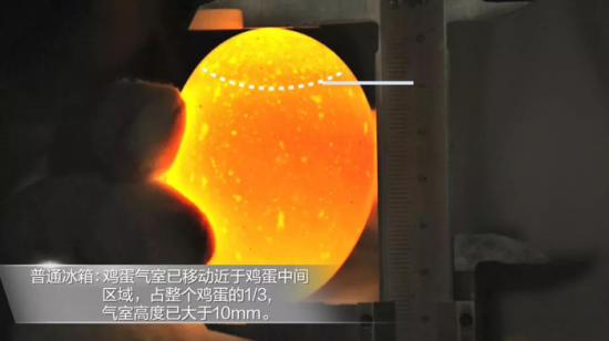 普通冰箱內(nèi)雞蛋氣室已移動近于雞蛋中間區(qū)域,占整個雞蛋的1/3,氣室高度已大于10mm;卡薩帝F+冰箱內(nèi)雞蛋氣室從大頭蛋殼方向向小頭方向有一定位移,氣室高度小于6mm,2臺冰箱的保鮮情況顯而易見。