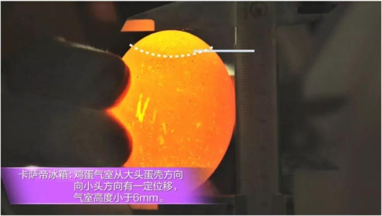 ◆卡薩帝F冰箱內(nèi)雞蛋氣室從大頭蛋殼方向小頭方向有一定位移,氣室高度<6mm