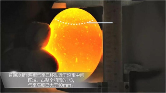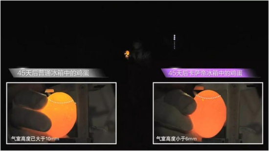 實(shí)驗(yàn)可知,卡薩帝F冰箱內(nèi)雞蛋儲(chǔ)存45天后,氣室高度依然小于6mm,證明雞蛋依舊新鮮。