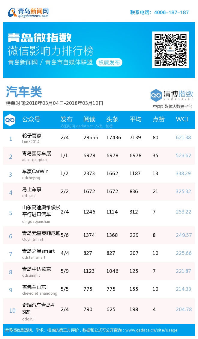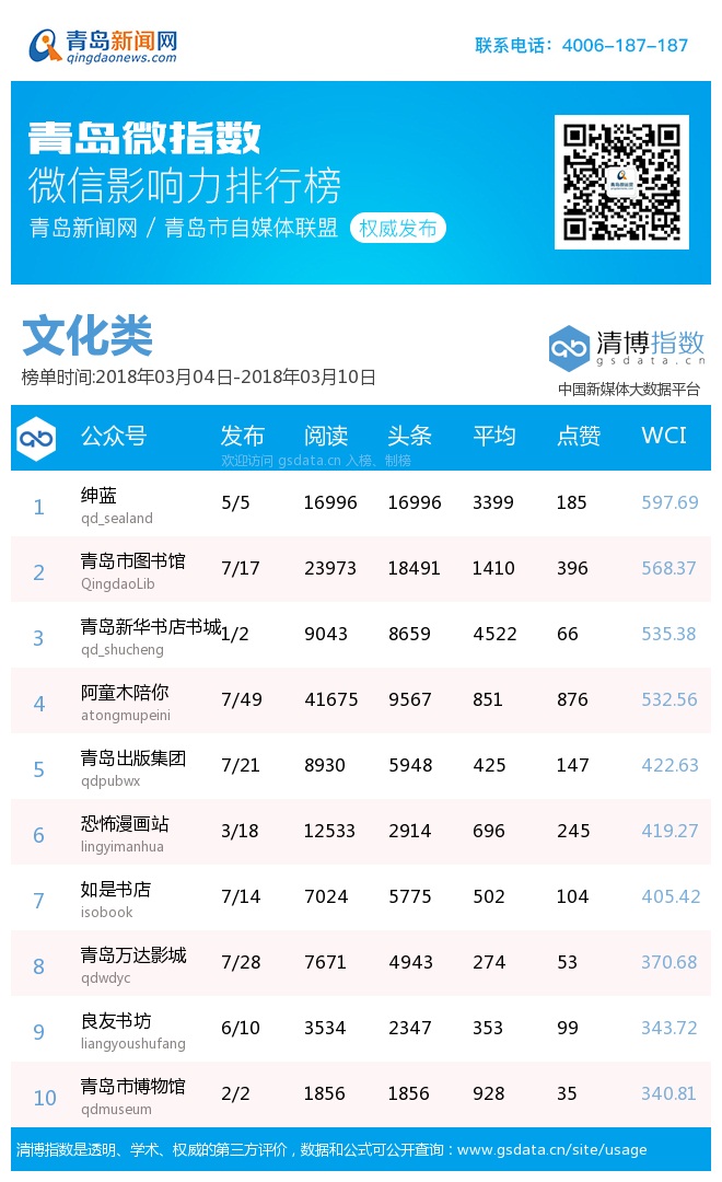 青島新聞網(wǎng)3月12日訊 (記者邢書玲)由青島新聞網(wǎng)、清博指數(shù)平臺(tái)聯(lián)手打造的“青島微指數(shù)微信影響力排行榜”今日發(fā)布一周(3.4—3.10)榜單。與上期相比,本期數(shù)據(jù)整體呈下滑趨勢(shì),WCI指數(shù)超900的微信公眾號(hào)僅5家,分別是“青島交警”、“青島12333”、“青島日?qǐng)?bào)、”“青島早知道”、“海信微電視”。