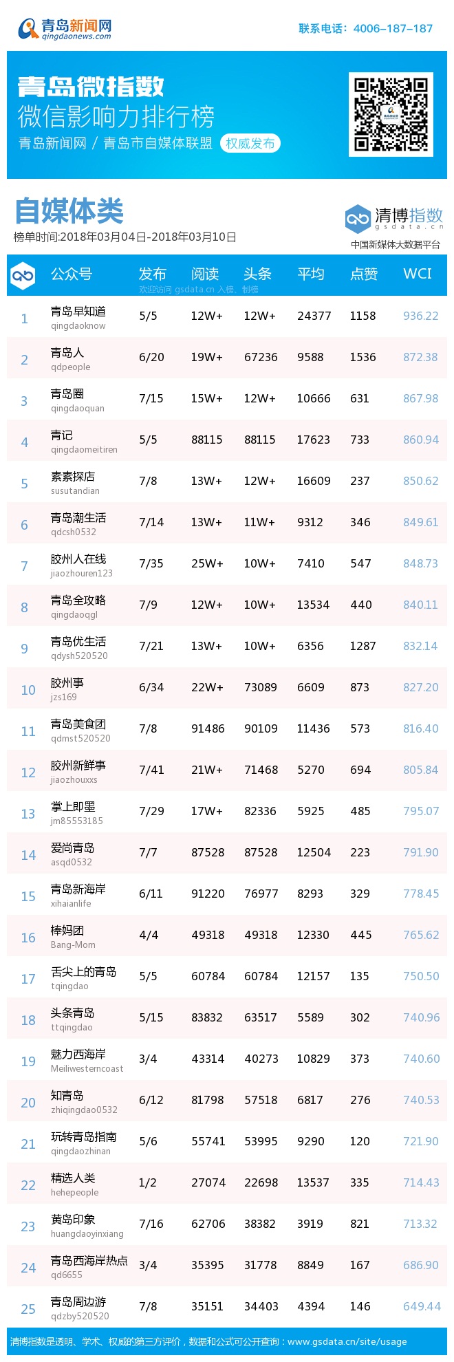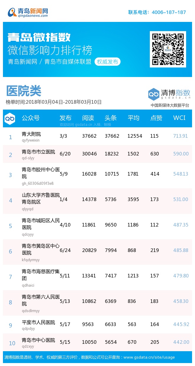 1、“青島微指數(shù)微信影響力排行榜”由青島新聞網(wǎng)聯(lián)合清博指數(shù)平臺(tái)聯(lián)手打造的“青島微指數(shù)微信影響力排行榜”,通過對(duì)各行業(yè)微信公眾號(hào)的日常監(jiān)測(cè),對(duì)所有賬號(hào)在統(tǒng)計(jì)周期內(nèi)所發(fā)布內(nèi)容的發(fā)文總數(shù)、總閱讀數(shù)、頭條閱讀數(shù)、平均閱讀數(shù)及總點(diǎn)贊數(shù)等海量數(shù)據(jù)進(jìn)行分析,幫助各行業(yè)新媒體小編更好地運(yùn)營微信。
