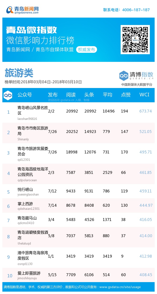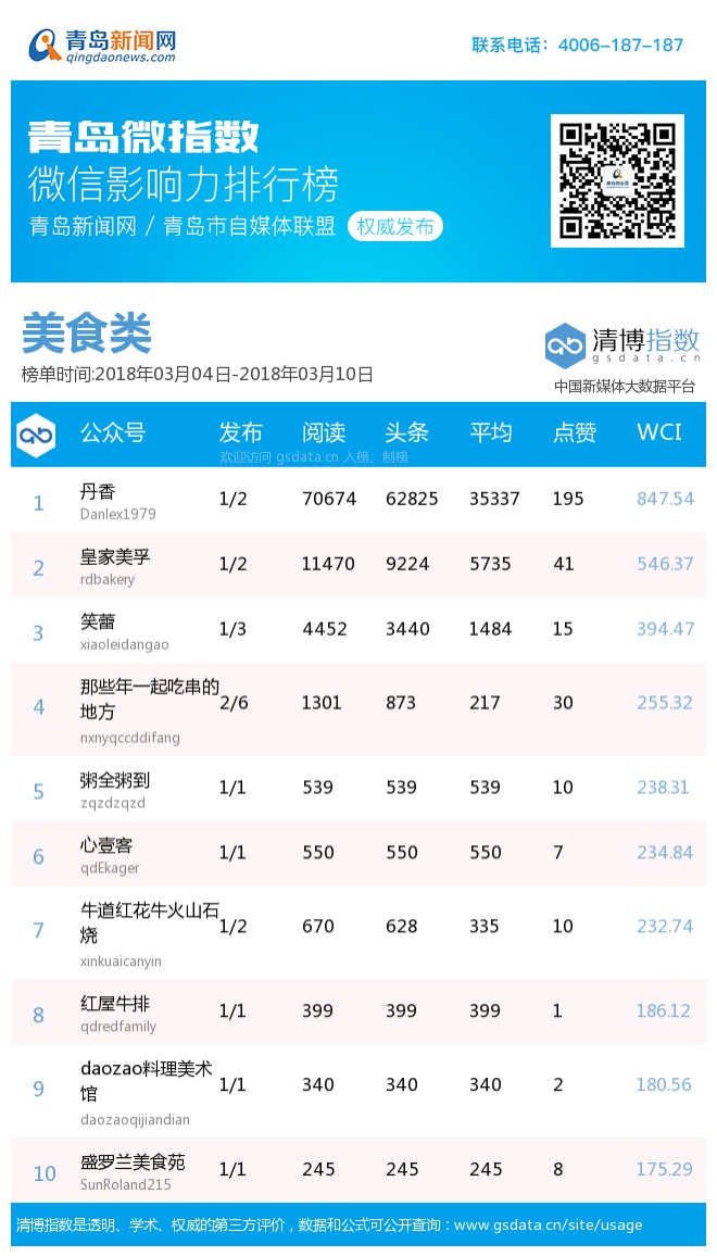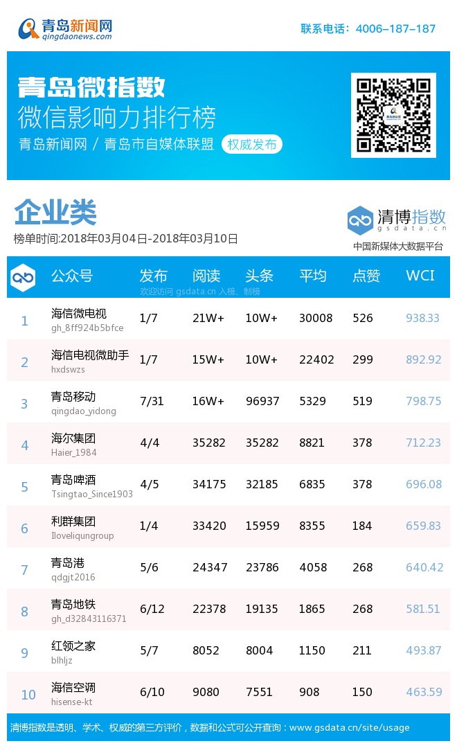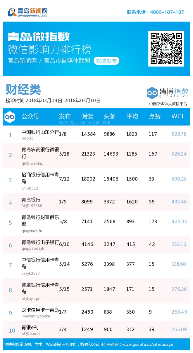 3、本次榜單收錄了青島14個(gè)行業(yè)微信公眾號(hào),如您的賬號(hào)暫未收錄,可聯(lián)系4006-187-187。