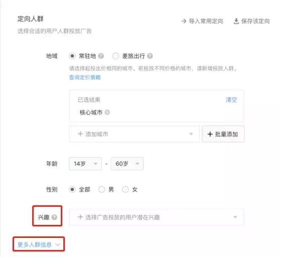 投廣告最怕就是“投”不到目標(biāo)人群,花大錢沒達(dá)到理想轉(zhuǎn)化。在創(chuàng)建小程序廣告時(shí),提供了一共14個(gè)人群細(xì)分領(lǐng)域,除了基礎(chǔ)的地域、年齡、性別基礎(chǔ)信息選擇外,還提供了興趣、學(xué)歷、婚戀狀態(tài)、手機(jī)系統(tǒng)等領(lǐng)域選擇。