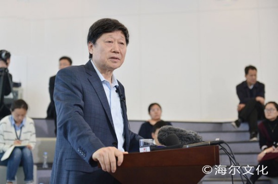 海爾集團(tuán)董事局主席、首席執(zhí)行官?gòu)埲鹈艚邮苊襟w采訪。