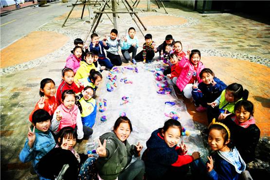 孩子們帶著標(biāo)好記號(hào)的“作品”來(lái)到室外,志愿者們會(huì)幫孩子們晾曬起來(lái),等到圍巾干透,一件自己親手制作的圍巾才算真正完成。