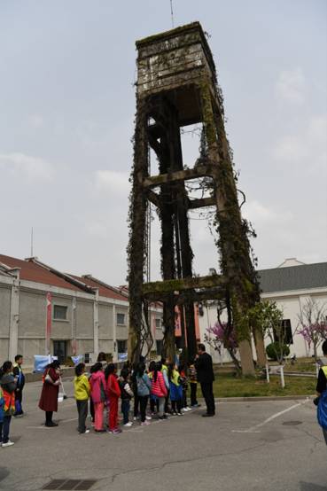 王館長(zhǎng)首先給孩子們介紹了博物館最高的建筑——建于1934年的水塔,它被譽(yù)為青島紡織博物館的“迎賓塔”。孩子們?cè)诎耸鄽q“高齡”的“迎賓塔”面前贊嘆不已。