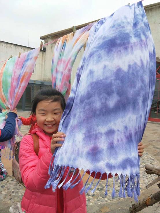 然后根據(jù)自己的喜好,孩子們把圍巾疊成合適的形狀,用皮筋把疊好的圍巾緊緊捆住,再滴上特制的不褪色染料,這簡(jiǎn)單的步驟親自動(dòng)手做起來(lái)可并不容易!