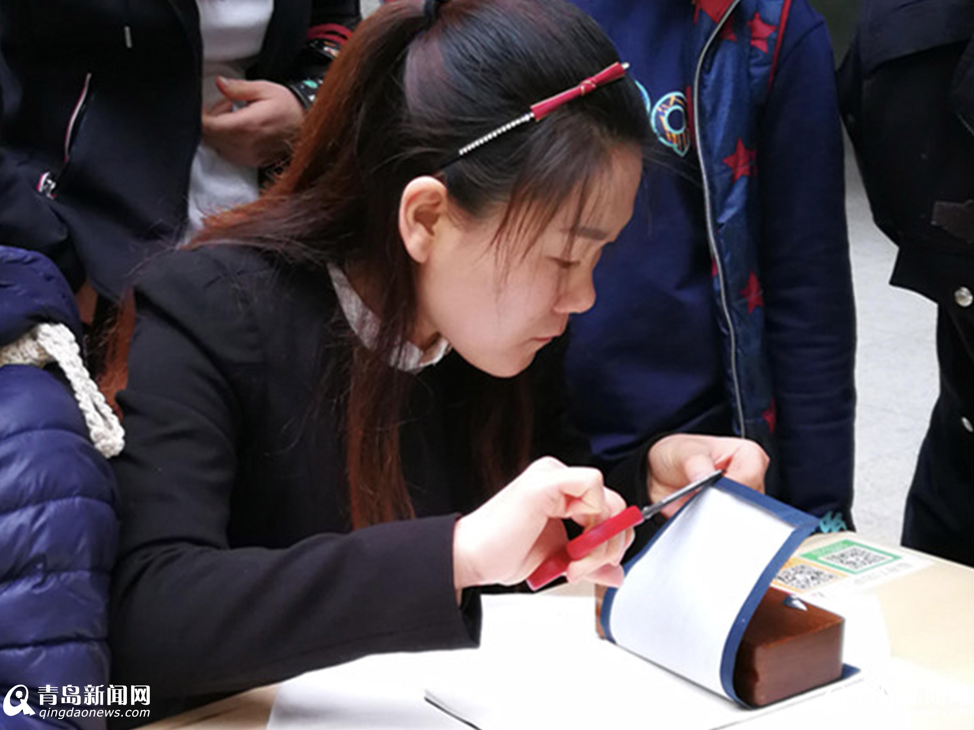 21日上午,青島市圖書館在二樓大廳為市民們舉辦了“傳拓技藝體驗”及“縫制一本線裝書”活動。市圖書館的專業(yè)古籍人員帶大家將宣紙覆在石刻上面,然后用刷子慢慢拓出清晰的文字,親身體驗了傳拓技藝的神奇魅力。