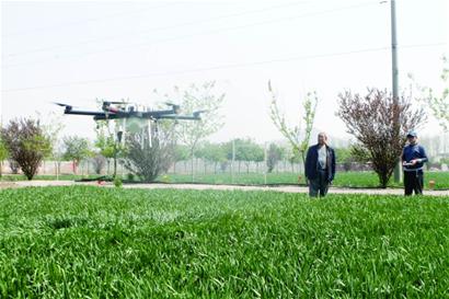 技術(shù)人員用無人機為小麥噴灑農(nóng)藥。