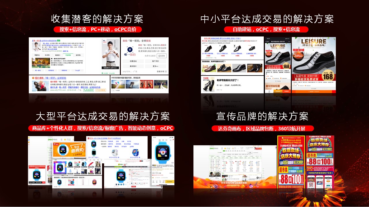 助力中小企業(yè)發(fā)展,營銷需要找到人更要找對人想要推廣,第一步就要找到人。PC+移動的融合時代,用戶是分散的,他們休閑旅游,居家生活,外出辦公,喜歡看新聞,看電影,玩游戲…不同的生活場景,不同的用戶聚集地。如何找到他們呢?需要覆蓋不同生活場景的多樣產(chǎn)品,無論用戶辦公還是休閑,瀏覽網(wǎng)站還是使用手機,都能有效地將企業(yè)信息推送至用戶眼前。這些,360可以做到,這也是企業(yè)被用戶認知的第一步。目前,360已經(jīng)幫助游戲、裝修服務、出國移民等300+行業(yè)廣告主找到潛在客戶。