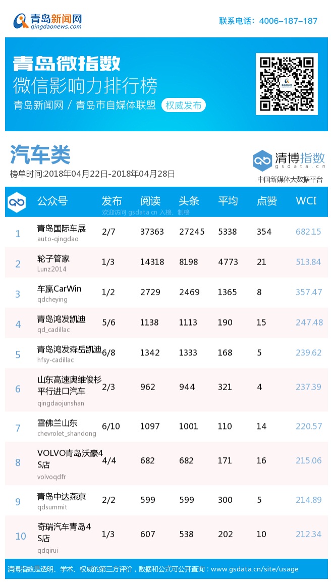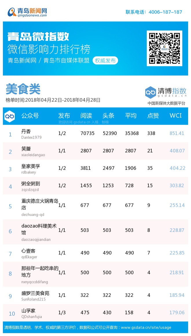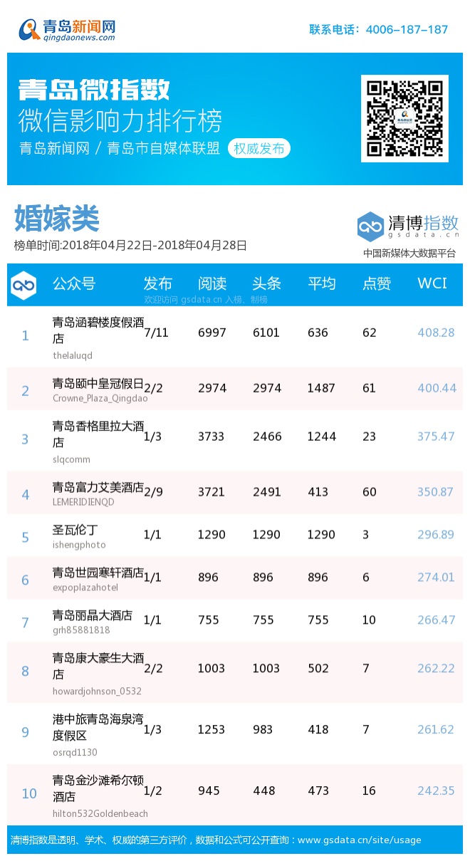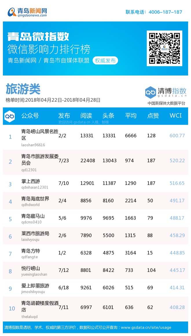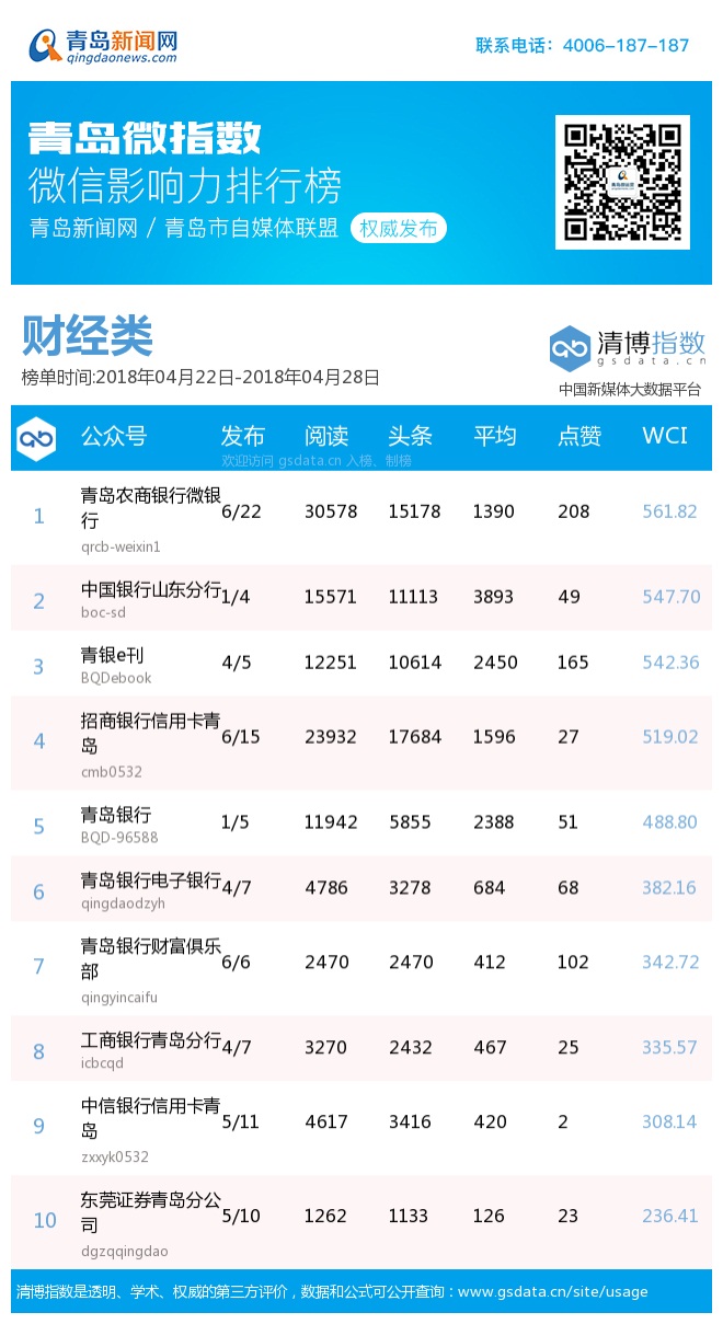 3、本次榜單收錄了青島14個行業(yè)微信公眾號,如您的賬號暫未收錄,可聯(lián)系4006-187-187。