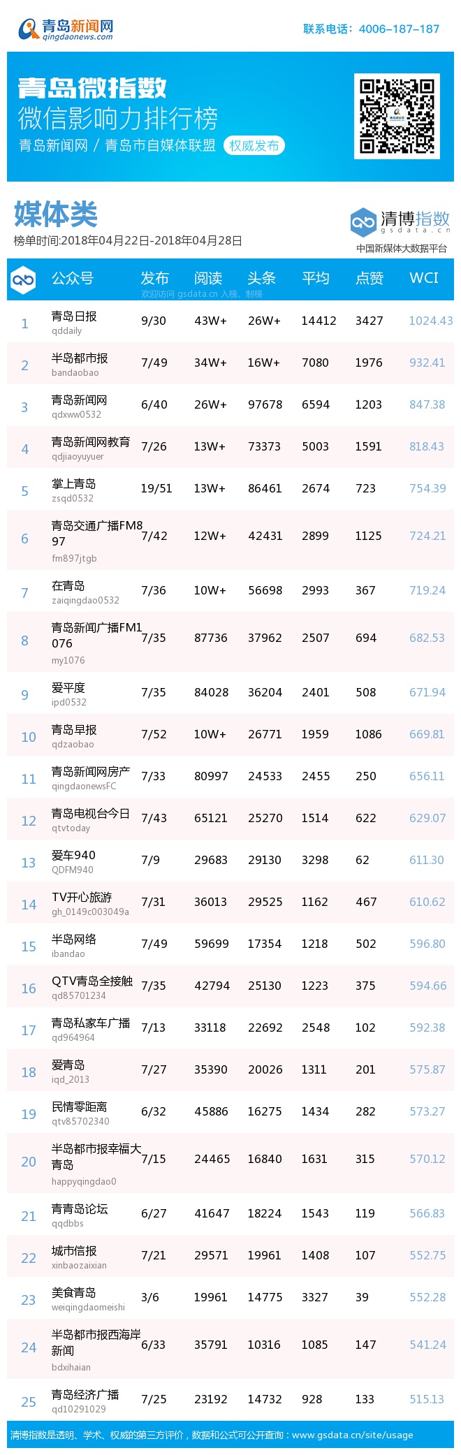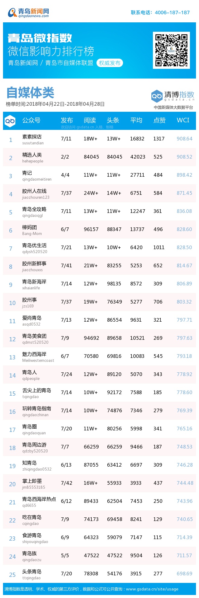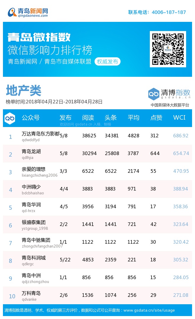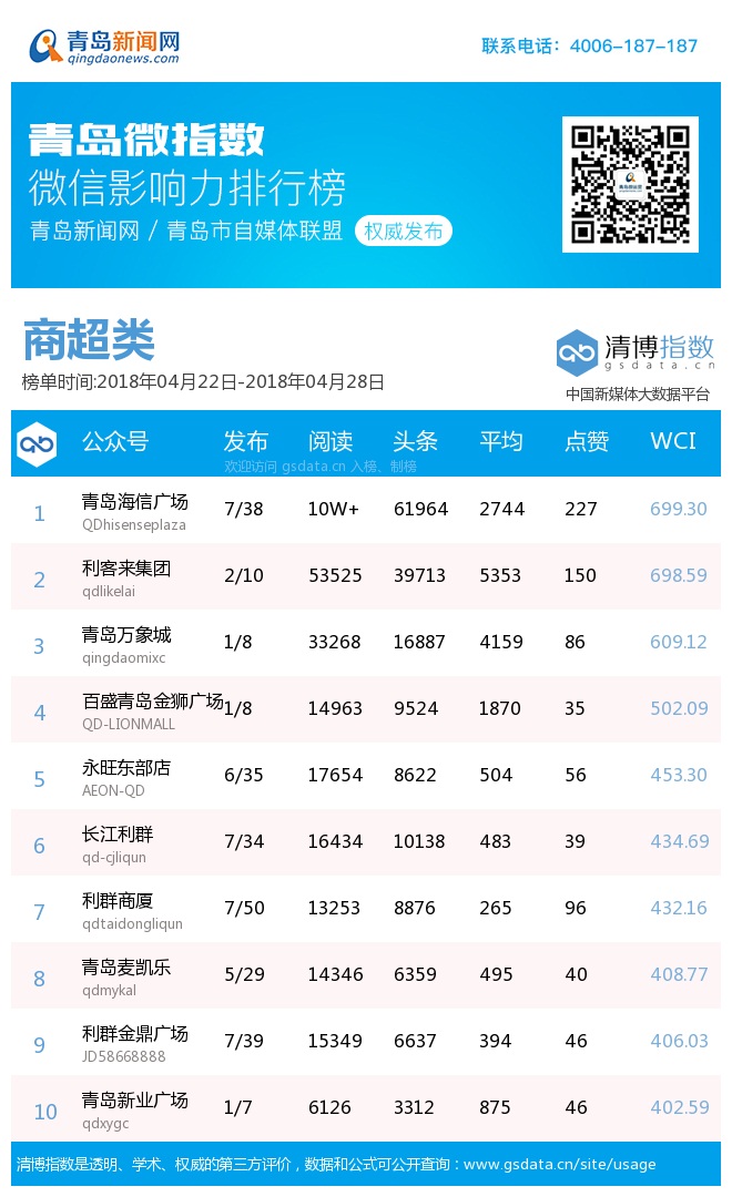 3、本次榜單收錄了青島14個行業(yè)微信公眾號,如您的賬號暫未收錄,可聯(lián)系4006-187-187。