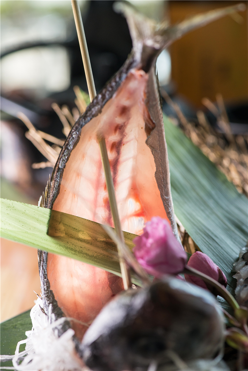 頗受日本大眾喜愛的竹莢魚,刺身是最好的食用方法,雅·日本料理的廚師,有自己處理新鮮竹莢魚的訣竅,雙手用冰水浸透,使手和魚肉同溫,冰水里加入鹽,調(diào)成濃度與海水相同的比例,這樣處理的竹莢魚與別地不同,除了食材本身的新鮮,魚肉與油脂又得以收縮,使竹莢魚的味道更加銳利清晰。
