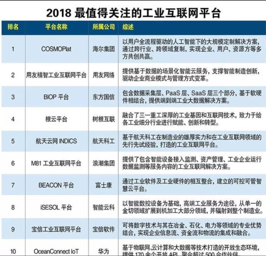 5月2日,《互聯(lián)網(wǎng)周刊》與eNet研究院共同發(fā)布《2018最值得關(guān)注的工業(yè)互聯(lián)網(wǎng)平臺(tái)》,海爾COSMOPlat、用友精智工業(yè)互聯(lián)網(wǎng)平臺(tái)、東方國(guó)信BIOP平臺(tái)位列TOP3,樹(shù)根互聯(lián)根云平臺(tái)以及航天云網(wǎng)INDICS分列4、5。在同日發(fā)布的《2018工業(yè)互聯(lián)網(wǎng)解決方案提供商TOP100》中,海爾與華為、富士康位列TOP3,兩份榜單中海爾均位列榜首。