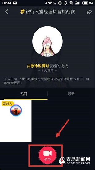 Step2.點擊下方#銀行大堂經(jīng)理抖音挑戰(zhàn)賽#話題,進入作品頁,點擊參與按鈕