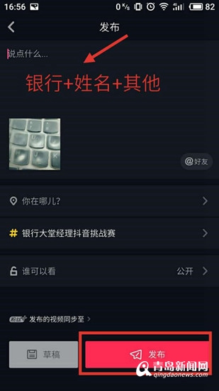 Step4.根據(jù)自己的喜好對視頻進行加工處理,并發(fā)布。在發(fā)布界面“說點什么....”中統(tǒng)一按“銀行+姓名+其他(介紹或宣言或其他想說的話)”填寫,點擊發(fā)布按鈕。發(fā)布成功即為參賽。