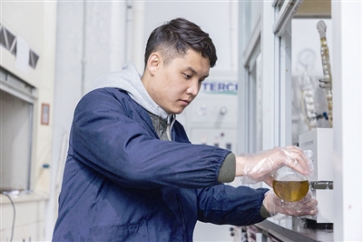 中國石油大學(xué)(華東)化工學(xué)院材料合成實驗室里,身穿深藍(lán)色工作服的葉爾哈力在工作臺前操縱著各種儀器設(shè)備,探尋重質(zhì)油、輕質(zhì)油轉(zhuǎn)化的奧秘——催化劑。在這間實驗室里,葉爾哈力幾乎每天都要花上幾個小時做實驗,有時甚至超過十個小時。