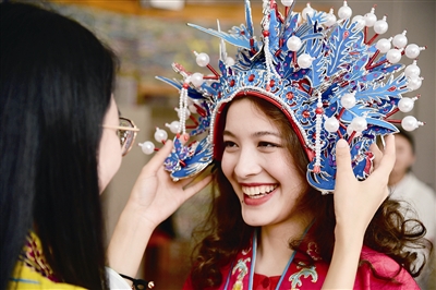 ▲在中國石油大學(xué)(華東)大學(xué)生活動中心,哈薩克斯坦留學(xué)生珍珠和京劇愛好者一起體驗(yàn)國粹文化。新華社照片