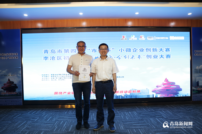 青島市中小企業(yè)公共服務(wù)中心副主任趙鳳和(右一)為項(xiàng)目一等獎(jiǎng)?lì)C獎(jiǎng)