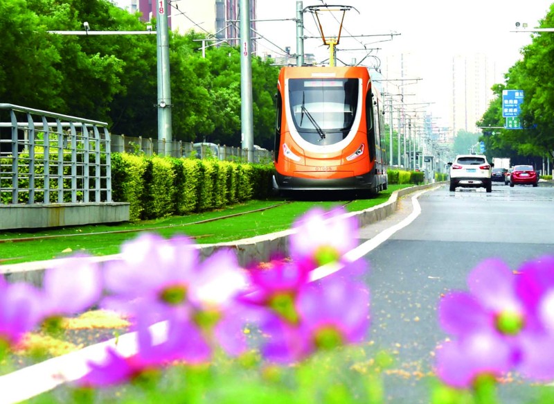 6月4日,一輛有軌電車行駛在青島市城陽區(qū)春陽路上。新華社發(fā)