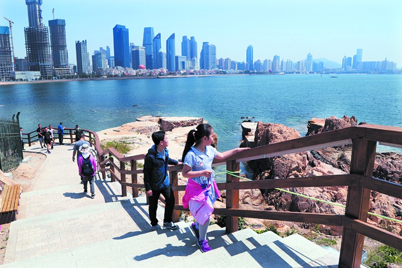 對(duì)于青島而言,濱海步行道串起了青島沿海一線最美的風(fēng)景,木棧道一側(cè)連山看城,另一側(cè)聽(tīng)濤望灣?!吧?、海、城、灣”融為一體,猶如人在畫中游。