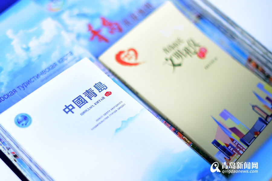 志愿服務驛站里擺放著青島的宣傳冊和旅游圖冊,這些對游客們很有幫助。