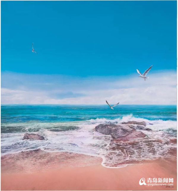 青島市美協(xié)主席王紹波,此次為上合峰會創(chuàng)作了巨幅作品《碧海長天》?!侗毯iL天》以布面丙烯為媒介材料,充分運(yùn)用了水彩畫水色通透的技法和表現(xiàn)語言。以藍(lán)天大海為創(chuàng)作主題,通過對海天、激浪等自然風(fēng)貌的描繪,意在表現(xiàn)豁達(dá)通暢、高遠(yuǎn)昂揚(yáng)的意境和情懷,翱翔在天空的海鷗象征著對理想、信念的抒發(fā)和追求。