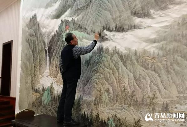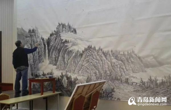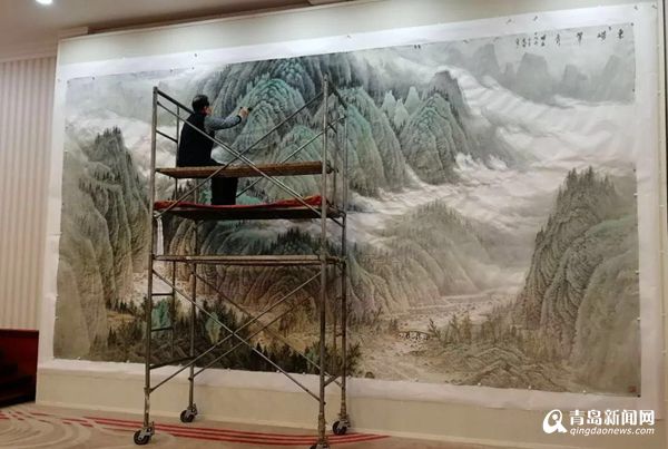 在青島國際會議中心會議貴賓室,巨幅山水《東嶗翠秀》吸引了中外記者的注意,這幅作品正是由青島畫院名譽(yù)院長曾先國創(chuàng)作的。在接到創(chuàng)作任務(wù)通知后,曾先國便開始思索,怎樣才能創(chuàng)作出既體現(xiàn)中國氣派、山東特色又能展現(xiàn)青島風(fēng)采的中國畫作品呢?最終,曾先國決定創(chuàng)作一幅以嶗山為題材的山水畫作品,并選取嶗山最具代表性的景點(diǎn)北九水作為創(chuàng)作范本。曾先國幾次深入實(shí)地寫生,探尋創(chuàng)作靈感,使作品能夠更全面的展示作品的精神內(nèi)涵及嶗山特有的壯觀氣勢。