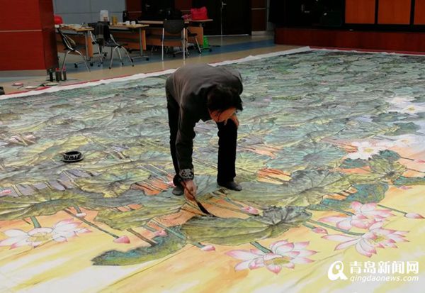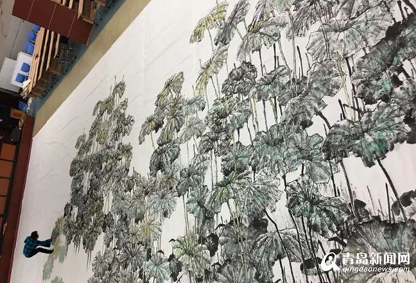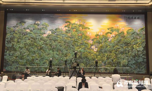 一幅長約17米,寬約7米的巨幅畫作《映日荷花》掛在上合青島峰會主會場尚和廳里,顯得格外醒目震撼,一望無際的青碧色荷葉中,粉色荷花點(diǎn)綴其間,紅日映照下的荷葉與荷花呈現(xiàn)出金色的光芒,恰如“接天蓮葉無窮碧,映日荷花別樣紅”的詩境。這幅巨作的作者正是島城畫家梁連生先生。