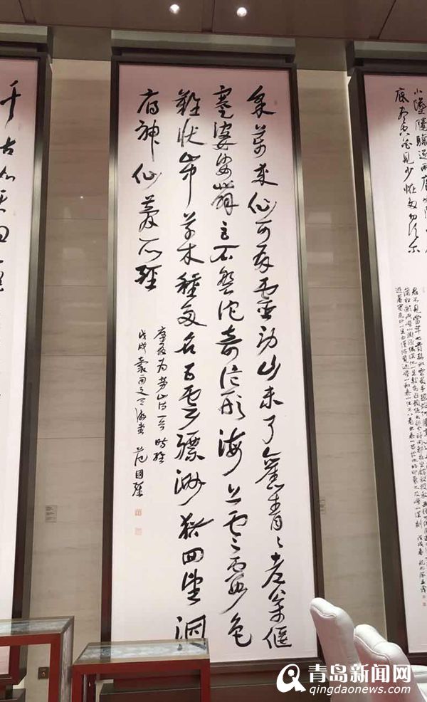 在青島國際會議中心的大廳里,十幅巨幅書法作品分外引人注目,其中的一幅《游嶗山歸途贈徐善伯》便是出自青島市書法協(xié)會主席范國強(qiáng)之手。作為唯一入選的島城書法家,范國強(qiáng)很快選定了康有為的詩作為創(chuàng)作內(nèi)容??涤袨橥砟暝谇鄭u居住,康有為故居至今仍是青島的熱門景點(diǎn),而形容島城美景最經(jīng)典的一句“紅瓦綠樹、碧海藍(lán)天”便是出自康有為的手筆。青島書法家書寫曾在青島居住過的文化名人贊青島的詩句,可謂是青島元素最淋漓盡致的體現(xiàn)了。