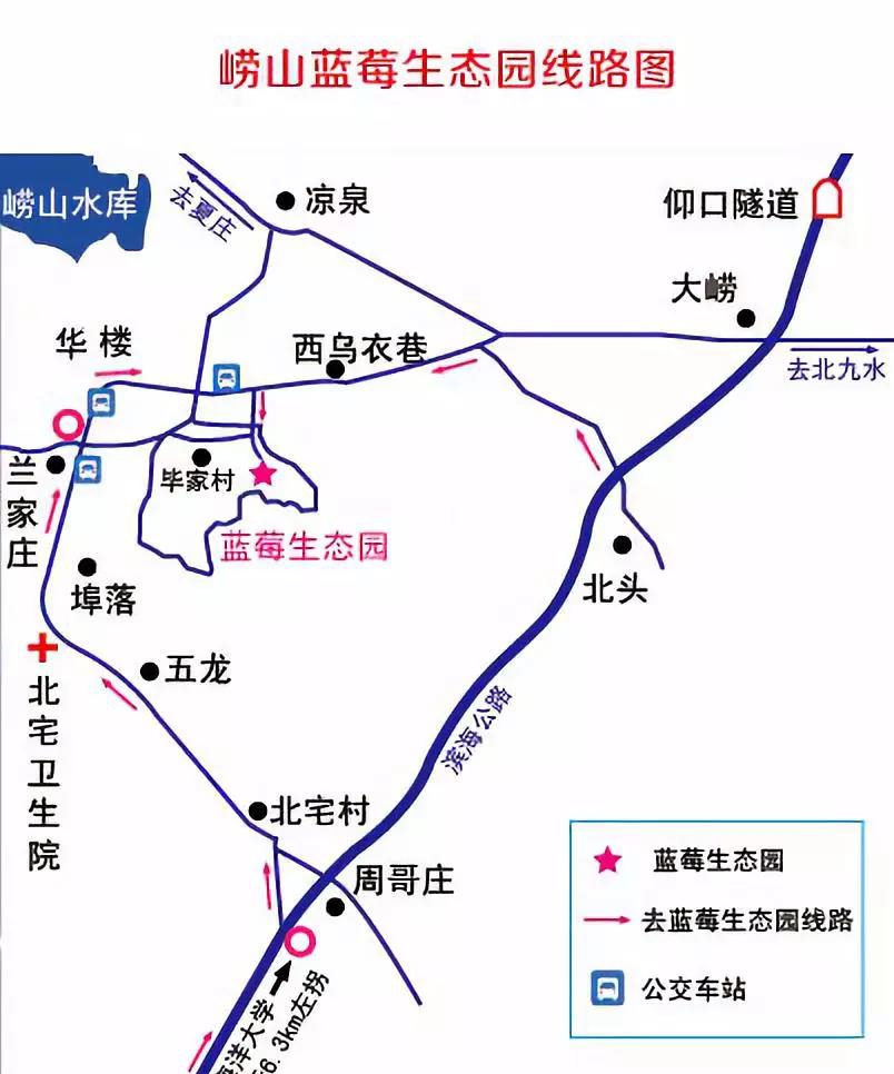 青島市區(qū)→濱海公路→地鐵11號(hào)線北宅站附近左轉(zhuǎn)→畢家村右轉(zhuǎn)→嶗山藍(lán)莓生態(tài)園