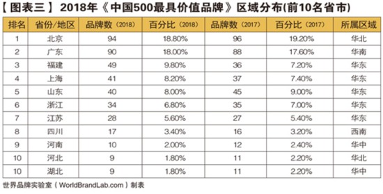從區(qū)域分布來看,得益于贏利能力強的央企總部的集中,北京有94個品牌入選;廣東和福建分別有90個和49個品牌入選,位居第二和第三。根據(jù)入選品牌影響力范圍大小,按照區(qū)域性、全國性和世界性對品牌進行劃分,具有全國范圍影響力的品牌有439個;具有世界性影響力的品牌數(shù)為51個,較去年有所提高。