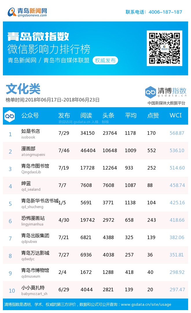 青島新聞網(wǎng)6月25日訊(記者 邢書玲)由青島新聞網(wǎng)、清博指數(shù)平臺聯(lián)手打造的“青島微指數(shù)微信影響力排行榜”今日發(fā)布一周(6.17—6.23)榜單。
