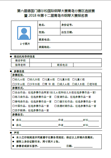 注:參加本次大賽可同時(shí)獲得第六屆德國(guó)門德爾松國(guó)際鋼琴大賽青島分賽區(qū)選拔賽證書和2018年第十二屆青島市鋼琴大賽證書,一賽雙證書。