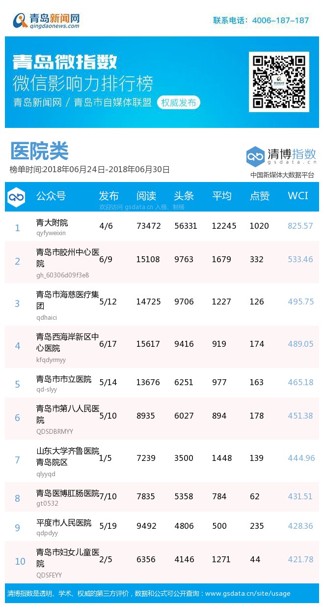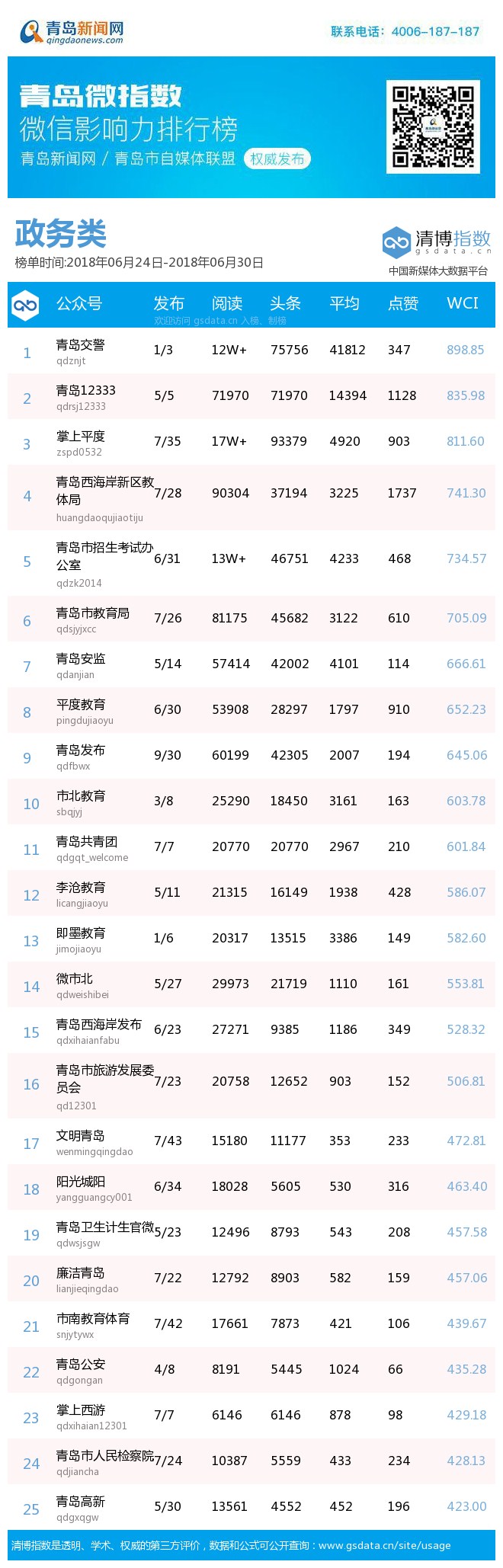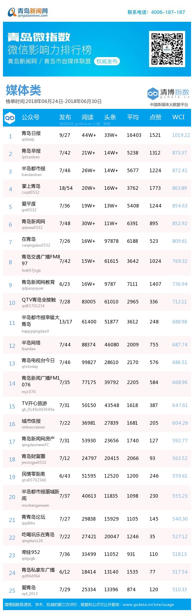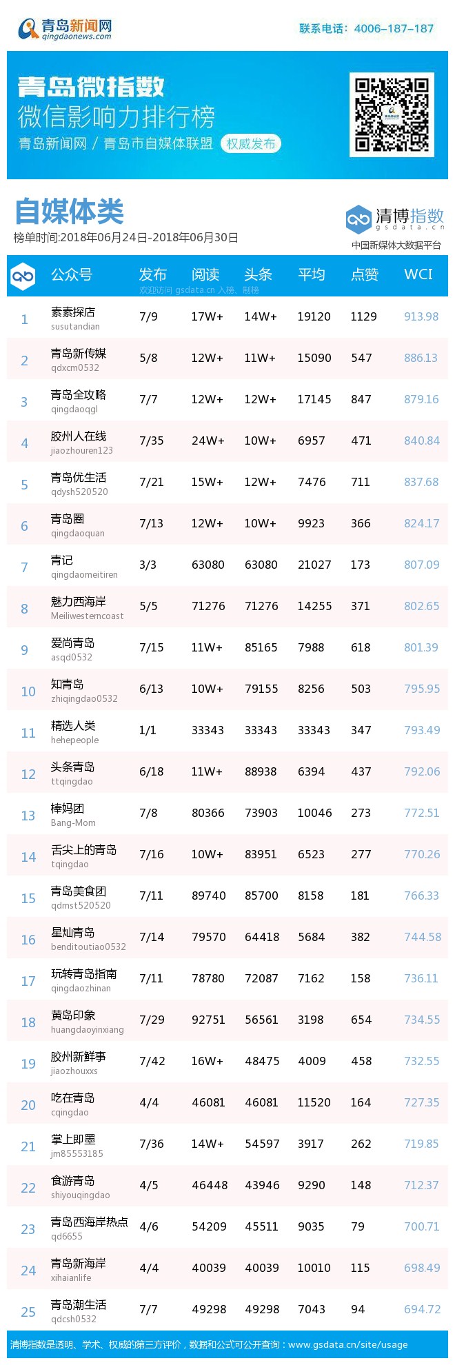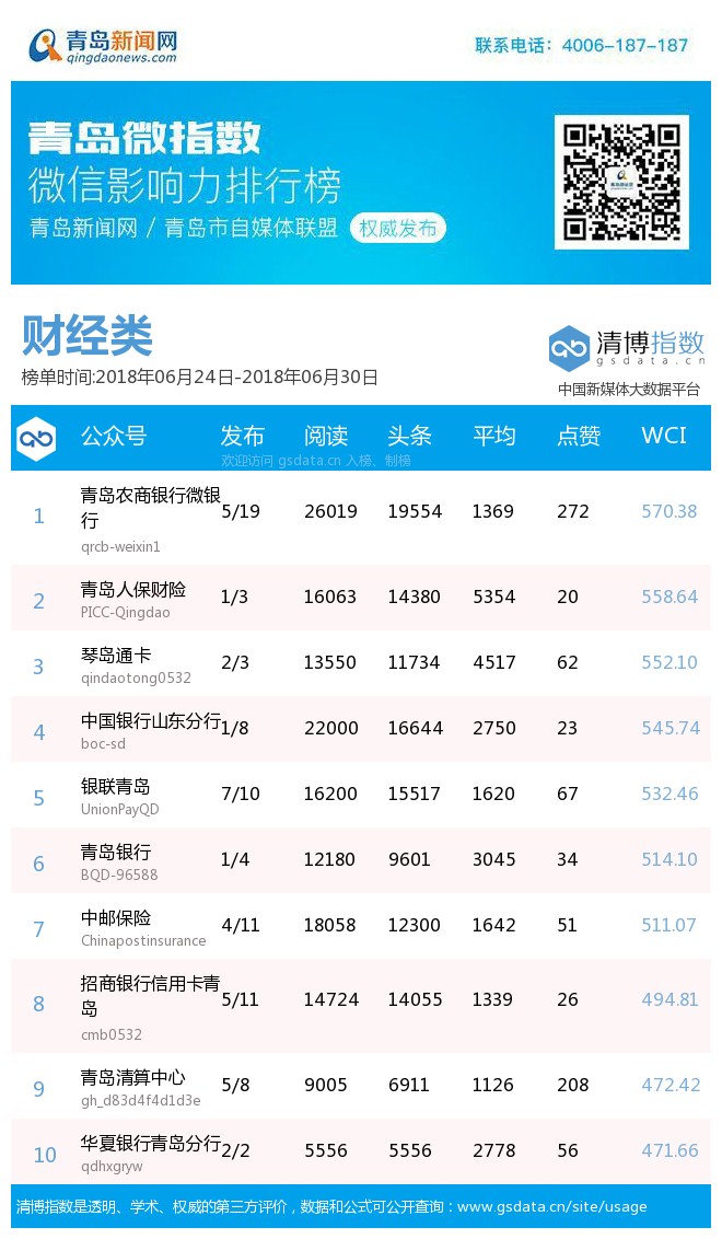 青島新聞網7月2日訊(記者 邢書玲)由青島新聞網、清博指數平臺聯手打造的“青島微指數微信影響力排行榜”今日發(fā)布一周(6.24—6.30)榜單。