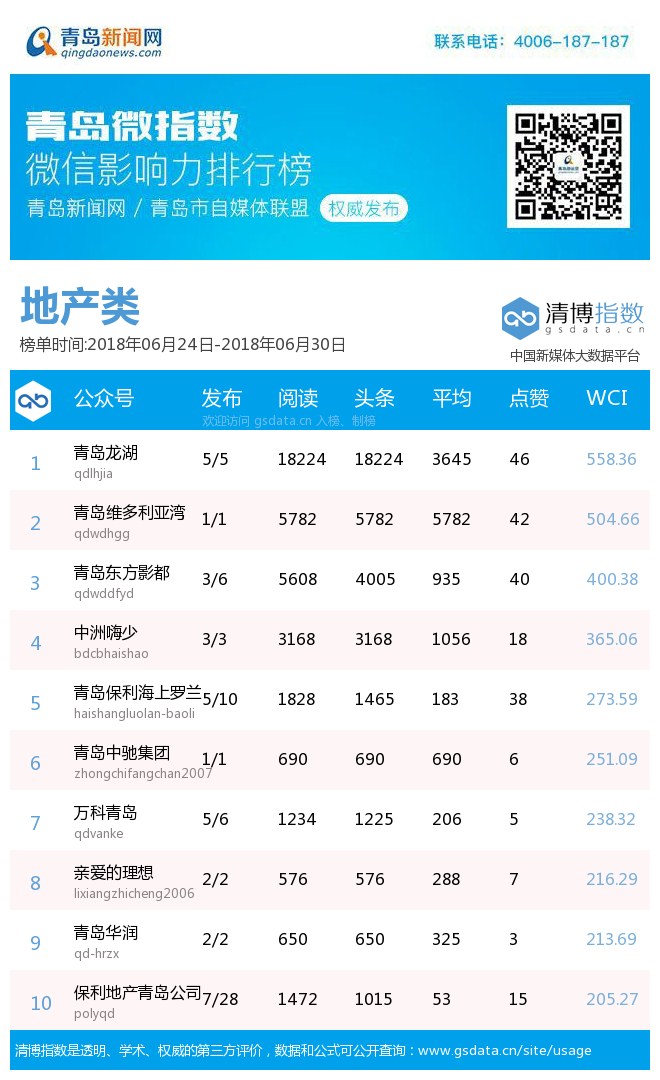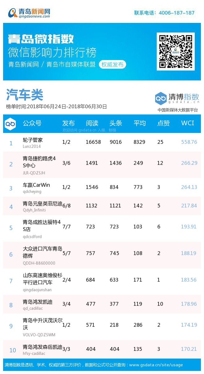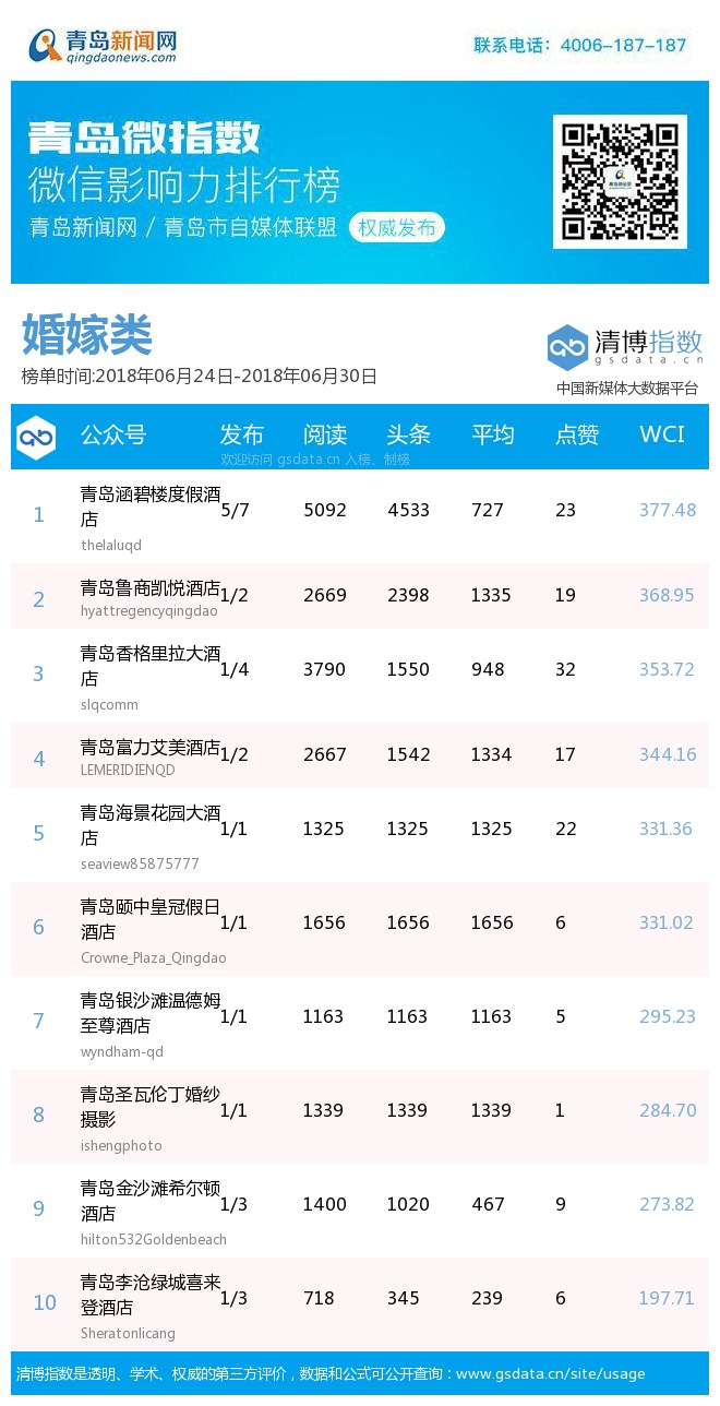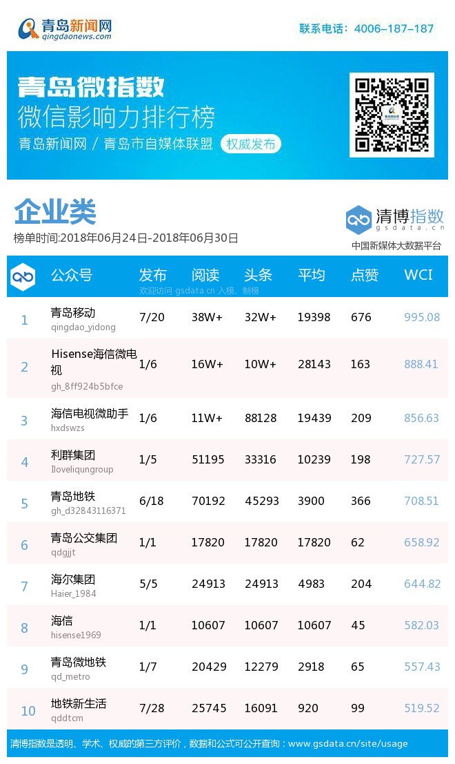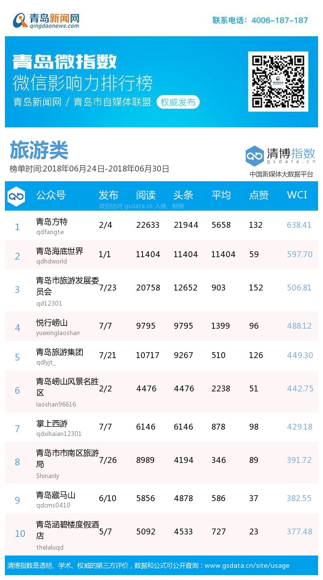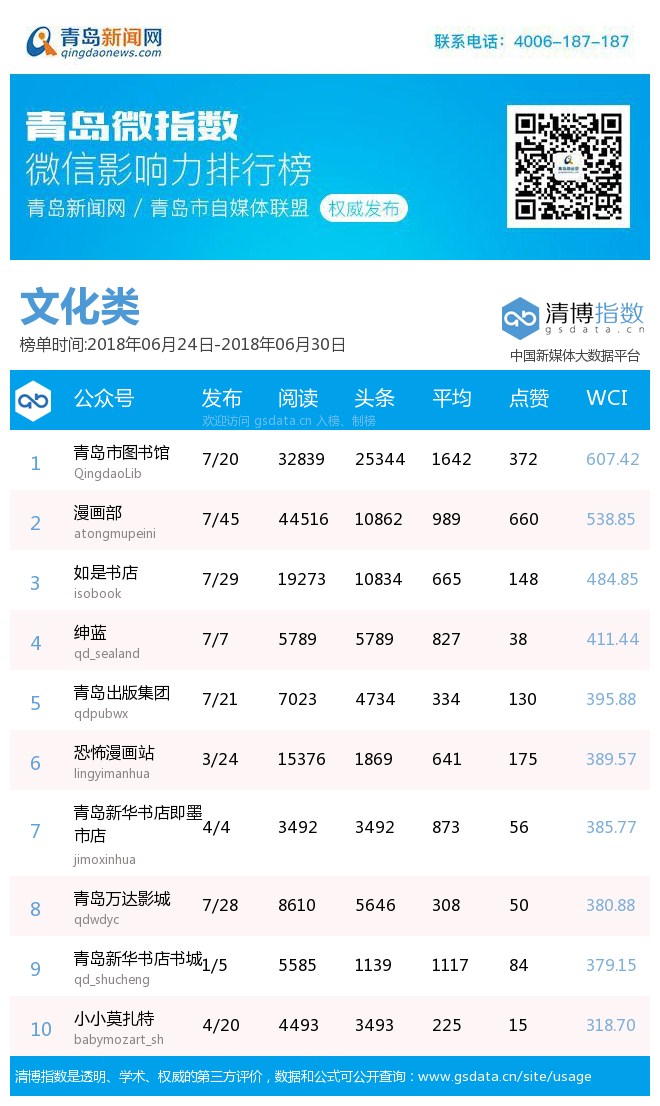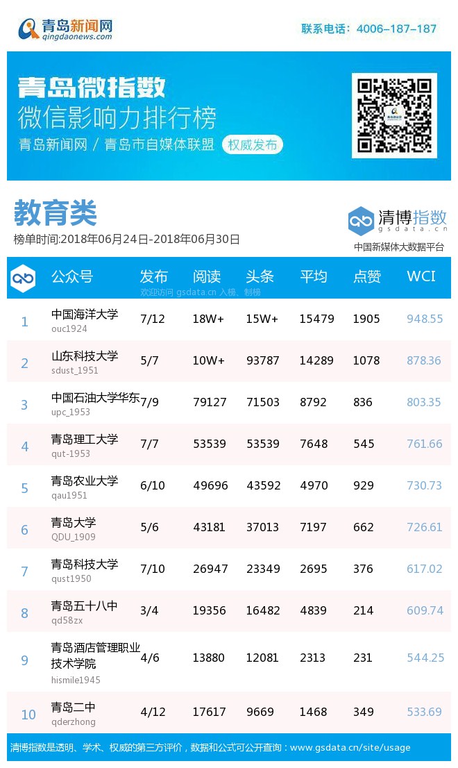 青島新聞網7月2日訊(記者 邢書玲)由青島新聞網、清博指數平臺聯手打造的“青島微指數微信影響力排行榜”今日發(fā)布一周(6.24—6.30)榜單。