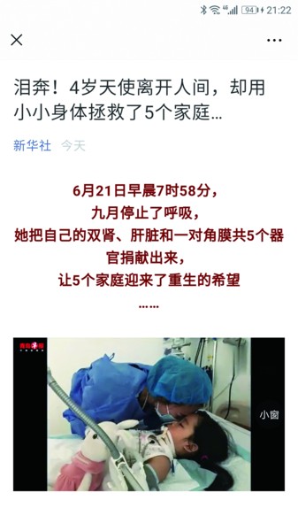 這是一個小天使的溫度。九月,剛剛四歲半,天性可愛,她還有一段舞蹈沒有跳完,她還有一個約定沒有和小朋友兌現(xiàn),她還有一個秘密沒有來得及跟老師說出來,她還有一個小小的愿望沒有等媽媽帶她去實現(xiàn)……她就離開了我們,她有那么多沒有實現(xiàn)的小心事,卻以自身的奉獻(xiàn)實現(xiàn)了別人的大心事,天使回天堂,大愛灑人間,她以自身的溫度救了5個家庭。