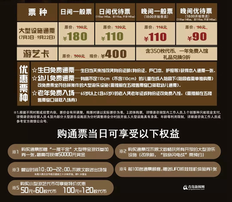 此外,7月3日-9月22日,世嘉都市樂園門票也有優(yōu)惠。大型設施通票日間僅需180元/人,晚間票110元/人,游藝卡只需400元/張(含350個代幣,一年免費入館,禮品兌換9折)。身高為1米-1.4米的顧客可以購買優(yōu)待票,日間110元/人,晚間90元/人。