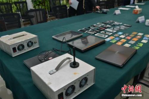 資料圖:浙江湖州吳興區(qū)警方現(xiàn)場展示繳獲的偽基站作案工具。(中新社發(fā) 吳興公安 攝)