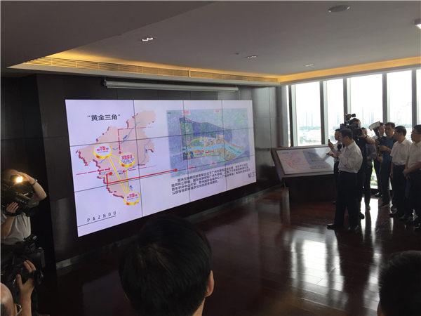 在廣州市海珠區(qū)環(huán)球貿(mào)易中心,代表團一行遠眺正在建設(shè)的琶洲互聯(lián)網(wǎng)創(chuàng)新集聚區(qū),聽取集聚區(qū)建設(shè)情況介紹,不時交流記錄。