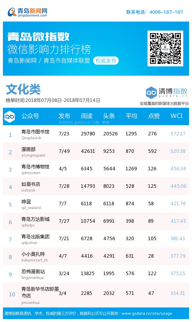 青島新聞網(wǎng)7月16日訊(記者 邢書玲)由青島新聞網(wǎng)、清博指數(shù)平臺聯(lián)手打造的“青島微指數(shù)微信影響力排行榜”今日發(fā)布一周(7.8—7.14)榜單。