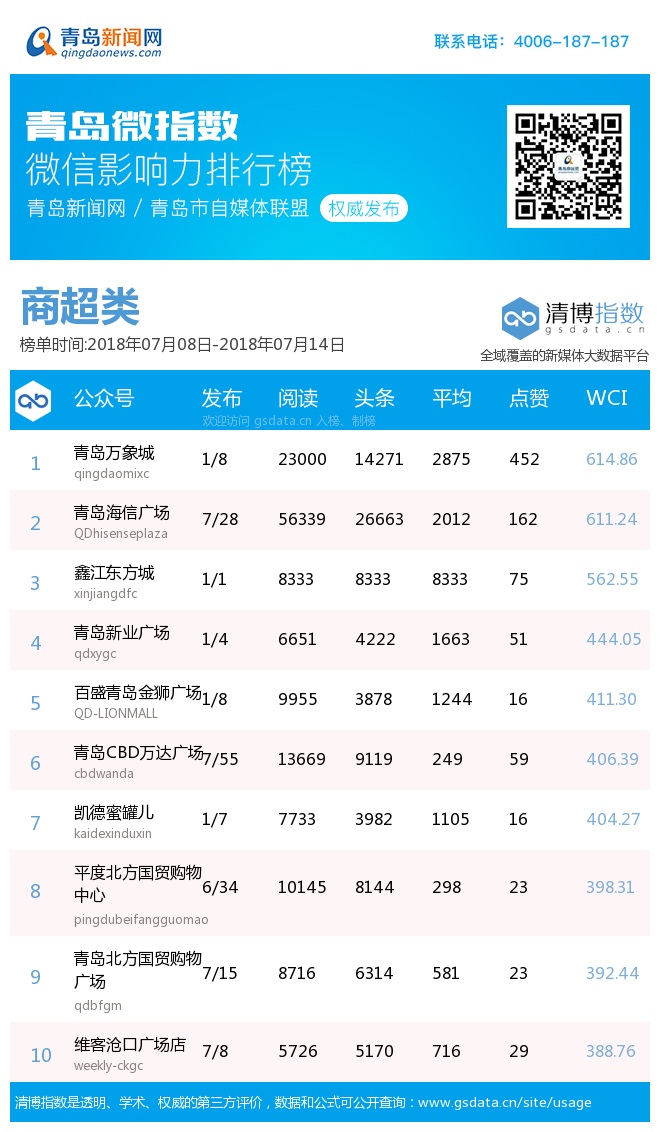 3、本次榜單收錄了青島14個行業(yè)微信公眾號,如您的賬號暫未收錄,可聯(lián)系4006-187-187。