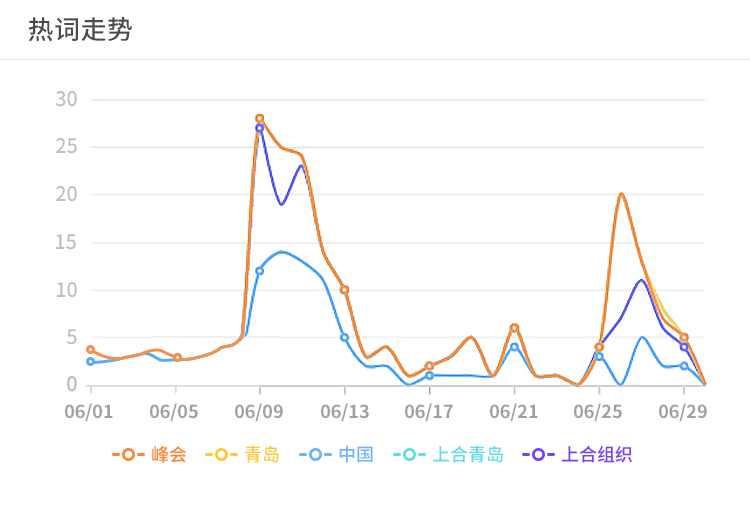 據(jù)熱詞走勢表顯示,在6月9號之前,關(guān)于峰會的熱門詞匯一直在0-5之間徘徊,6月9日之后,各端齊發(fā)力,紛紛發(fā)出關(guān)于峰會的最新報道,關(guān)于峰會、青島、上合青島、上合組織等熱門詞匯呈爆發(fā)式遞增,尤其是9號、10號這兩天,熱詞走勢更是接近30的峰值。