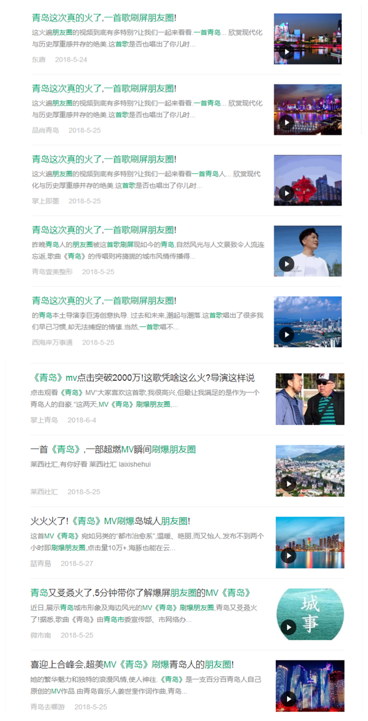 5月24日晚,“東唐”微信發(fā)布“青島這次真的火了,一首歌刷屏朋友圈”一文,《青島》MV首次進(jìn)入大眾視野,當(dāng)晚就瞬間刷爆微信朋友圈,成為現(xiàn)象級爆款作品。