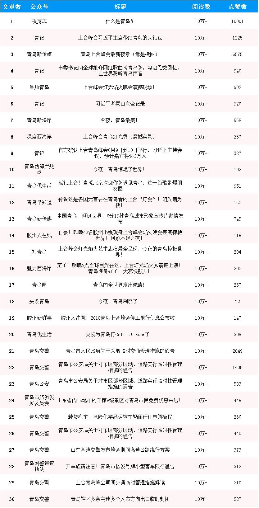 據(jù)清博后臺統(tǒng)計,在峰會10萬+爆文中,關(guān)于交通信息爆文占據(jù)14篇。便民信息刷爆青島市民朋友圈,既為大家出行提供便利,也保障了峰會期間交通順暢。