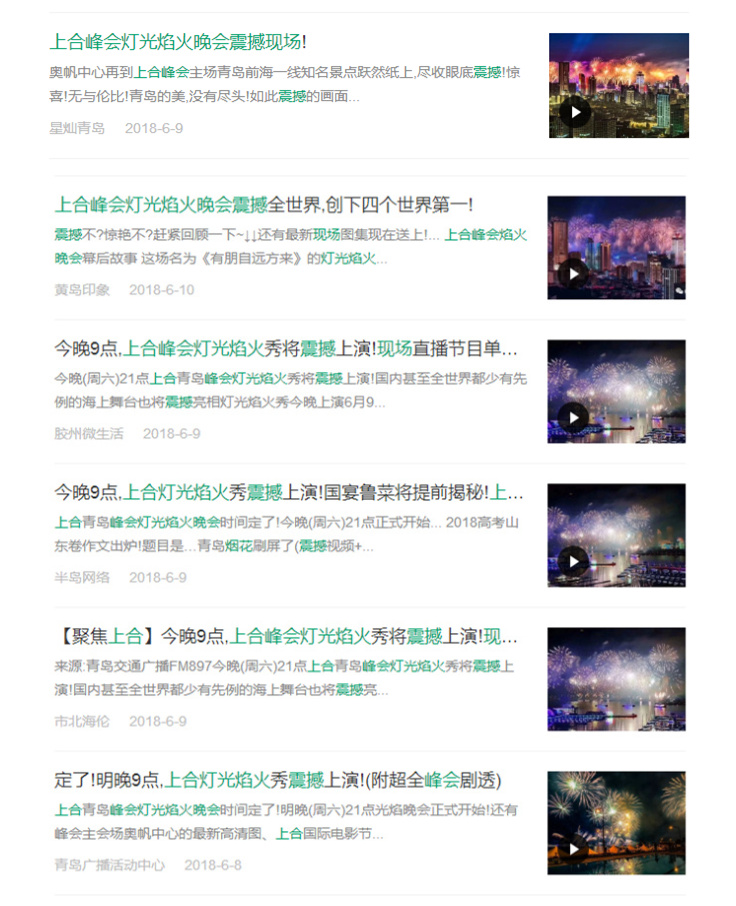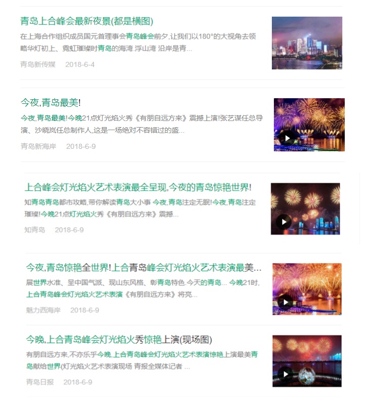 其中,像“青島新傳媒”發(fā)布的“青島上合峰會最新夜景(都是橫圖)”、“星燦青島”發(fā)布的“上合峰會燈光焰火晚會震撼現(xiàn)場!”、“青島新海岸”發(fā)布的“今夜,青島最美!”、“深度西海岸”發(fā)布的“上合峰會青島燈光秀(震撼實景)”等文章都在朋友圈起到了刷屏的效果。絢爛美麗的煙火,讓每個青島人都為之震撼和驕傲。