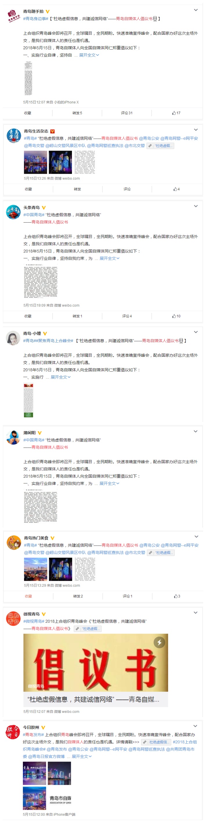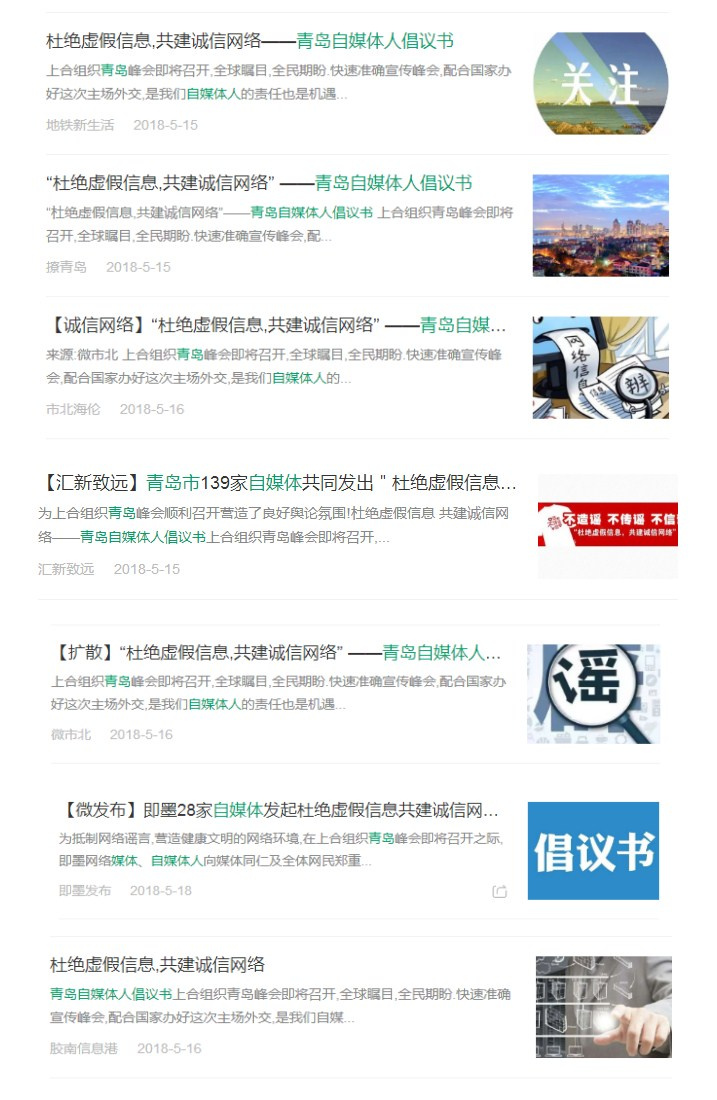 為保障上合組織青島峰會順利召開,5月15日青島市自媒體聯(lián)盟組織聯(lián)盟成員聯(lián)合發(fā)布“杜絕虛假信息,共建誠信網(wǎng)絡(luò)——青島自媒體人倡議書”,得到聯(lián)盟成員積極響應(yīng),共有139家自媒體積極發(fā)表倡議書,為峰會順利召開營造了良好的網(wǎng)絡(luò)環(huán)境。