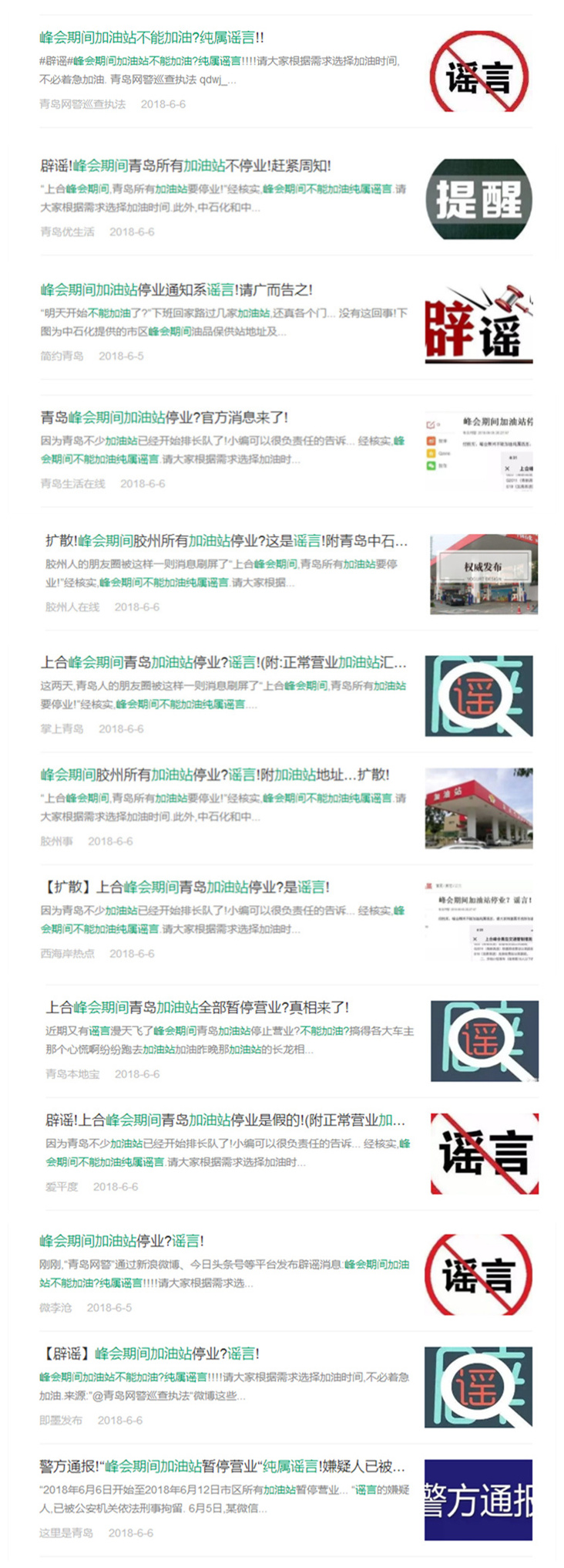 6月5日,某微信公眾號編造發(fā)布“2018年6月6日開始至2018年6月12日市區(qū)所有加油站暫停營業(yè)“謠言,在社會上造成惡劣影響?!扒鄭u公安”、“青島網(wǎng)警巡查執(zhí)法”第一時間發(fā)布辟謠信息,各大自媒體平臺像青島優(yōu)生活、青島本地寶、青島生活在線、膠州人在線、膠州事、西海岸熱點、黃島印象等百余家自媒體紛紛響應(yīng),在各自平臺轉(zhuǎn)發(fā)辟謠,迅速遏制了謠言傳播,減少了不必要的恐慌,為峰會順利召開肅清了網(wǎng)絡(luò)環(huán)境。